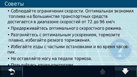 Розглянемо цю функцію детальніше, для чого заходимо в меню налаштувань і вибираємо ікону ecoRoute™. Для початкових установок, які в процесі використання ви можете змінити, вводимо типа палива, його ціну, середню витрату по міському і заміському циклу. Після декількох поїздок і перегляду звіту, ви можете внести корективи до звіту витрат, якщо вони сильно відрізняються від реальних. Можна зайняти себе, відточуючи стиль своєї їзди шляхом зменшення витрати палива, плавно прискорюючись на розгонах прагнучи підтримувати постійну швидкість руху. За це ваш навігатор нараховуватиме віртуальні бали, записуючи кращі результати в сторінку рекордів. Інформація про приблизну вартість поїздки завжди доступна на сторінці шляхового комп'ютера, а також в самому меню ecoRoute™. В узагальнення хочеться сказати про сторінку порад в меню ecoRoute™. Там можна знайти більше дюжини рекомендацій по економічній їзді, стільки не знайти навіть в авторитетних автомобільних журналах.
