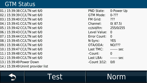 Дана можливість з'явилася у власників автомобільних навігаторів Garmin відносно недавно. Трансляція TMC даних наразі в Україні не діє – та й немає необхідності. А от більшість країн Європи вже оснащені даною хвилею віщання. Прийом дорожньої інформації в навігаторах Garmin влаштований дуже грамотно, що дозволяє отримувати найактуальнішу інформацію для прокладки маршруту з врахуванням заторів, що утворилися. При підключенні навігатора в прикурювач починає активуватися GTM приймач, скануючи весь діапазон FM частот в пошуку впевненого сигналу. Чим більше радіостанцій буде підключено для передачі даної інформації, тим більш якісно і оперативно навігатор оброблятиме отримані дані. Отримавши необхідну порцію інформації прилад готовий її обробити і відобразити на карті. На карті з'являється ікона з автомобілями, яка міняє свій колір залежно від міри напруженості на маршруті руху. Натискуючи на цю ікону ми потрапляємо в спеціальне меню, в якому можна відобразити затори на карті або проглянути їх список, в якому буде вказана передбачувана причина проблеми. Під час навігації стає доступна опція перегляду пробок на прокладеному маршруті, що очікують вас, які навігатор постарається об'їхати, не без вашої допомоги звичайно. Якщо якість сигналу стає неприйнятним для нормальної роботи приймача, він враховуватиме отриману раніше інформацію, і відновить її як тільки дозволять умови прийому. Можна легко поглянути як функціонує GTM приймач, для чого слід попасти в приховане інженерне меню навігатора. На сторінці з картою зайдіть в шляховий комп'ютер, потім натисніть на зображення спідометра і утримуйте на ньому палець. Через декілька секунд ви попадете в інженерне меню, де слід вибрати пункти: (Developer Info/GTM Status). Попавши в цей розділ вам стає доступною інформація про частоту на якій передається сигнал, режим роботи приймача, і головне - рівнь сигналу. В разі появи значень менше 20 - прийом дорожньої інформації стає неможливим. Можливі ситуації, особливо на початку використання навігатора, коли прилад зависай в пошуку частоти сигналу, тоді слід скинути данні таблиці постачальників через меню налаштувань навігатора.