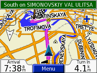 Отображение карты на экране Garmin Nuvi идеально для города. GPS-навигатор показывает только то, что вам нужно и минимум лишних деталей. Ваш маршрут сиреневым цветом выделяется среди остальных улиц, а повороты и развороты отображаются жирными стрелками. Карта выглядит очень понятно, причём как на минимальной детализации, так и на максимальной (на минимальной детализации отображаются только улицы, по которым вам предстоит ехать и водоёмы рядом с ними).
