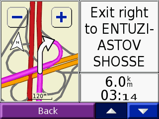 Как только вы определились с пунктом назначения, навигатор начинает режим сопровождения. На экране отображается карта, в верхней части пишется текстовая подсказка, куда и когда поворачивать, а ваше местоположение обозначается стрелкой на этой карте. В левом нижнем углу указывается время прибытия в место назначения, в правом - когда будет следующий поворот. Кликнув на правом поле вы переходите в режим просмотра поворотов и развязок у вас на пути.