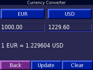 Конвертер валют, поддерживающий все основные валюты мира. Курс вам надо вводить самим. Обычная для сотового телефона функция теперь и в GPS-навигаторе.