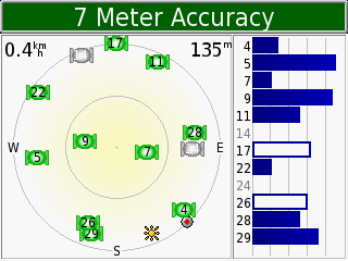 Возможно, ограничение возможностей чипа SIRFstar III связано с архитектурой аппаратной и программной части Nuvi. Ведь Nuvi имеет так много общего с приборами Garmin StreetPilot C320, и вероятно, некоторые функции более нового GPS-приёмника ограничиваются традиционным программным обеспечением или процессором навигатора. В любом случае, как вы можете видеть на скриншоте, уже при приёме сигналов с 8 спутников навигатор обеспечивает точность 7 метров, а зачастую и более высокую. Так что практической разницы между 12-канальным приёмником и 20-канальным вы едва ли ощутите, т.к. обычно приходится довольствоваться приёмом сигналов с 5-6 спутников.