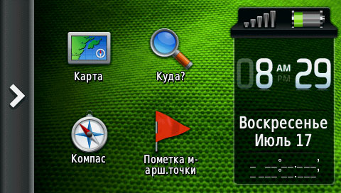 На головному екрані Montana 650 крупно відображається поточна дата, час і чотири піктограми швидкого доступу до основних сторінкам навігатора. Інші можливості приховані в додатковому меню. У порівнянні з Garmin Oregon, у якого всі піктограми були зібрані «в одну купу», таке рішення здалося нам дуже зручним.