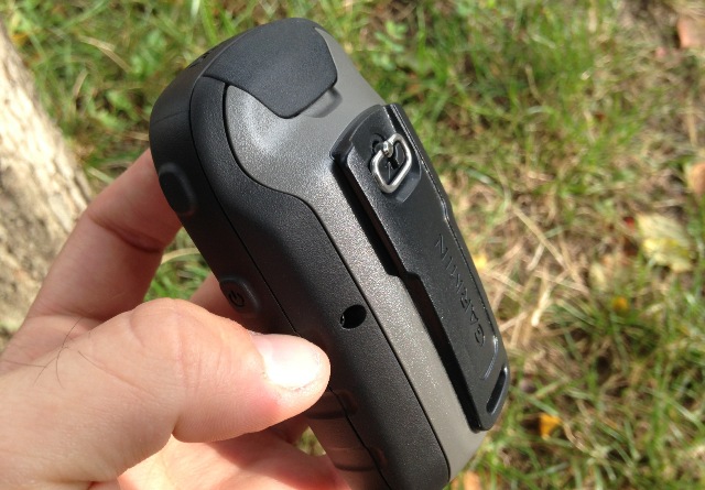 Навігатор Garmin eTrex 30 на тильній стороні має USB-порт, який надійно закривається прогумованою заглушкою. Кришка, що закриває акумуляторний відсік