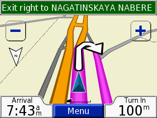 Отображение карты на экране Garmin Nuvi идеально для города. GPS-навигатор показывает только то, что вам нужно и минимум лишних деталей. Ваш маршрут сиреневым цветом выделяется среди остальных улиц, а повороты и развороты отображаются жирными стрелками. Карта выглядит очень понятно, причём как на минимальной детализации, так и на максимальной (на минимальной детализации отображаются только улицы, по которым вам предстоит ехать и водоёмы рядом с ними).