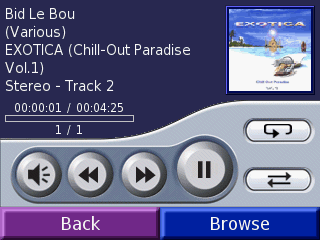 В Garmin Nuvi встроен программный MP3 плеер с простым и удобным для сенсорного экрана интерфейсом. Вы можете выбирать музыку по жанру, имени исполнителя или названию альбома. При воспроизведении на экране отображается маленькая иконка альбома и информация о композиции.