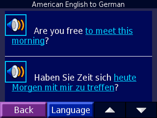 Вторая часть программы уже предлагает вам готовые фразы на нужном языке, отсортированные по категориям. Например, в категории "Food and Drink" фразы, касающиеся пищи. Вы выбираете фразу из списка и программа предлагает вам перевод. Вы можете прослушать как оригинал, так и переведённый текст. Причём, если у вас нет желания учить произношение, вы можете просто выбрать нужную фразу и вашему иностранному собеседнику скажет её сам Nuvi. К сожалению, в памяти навигатора загружена только демо-версия программы, а полная стоит 75$, но даже она не поддерживает русский язык.
