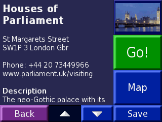 Нажав на кнопку "Go", вы заставите Garmin Nuvi проложить кратчайший маршрут до заданного объекта. Пользу подобной программы в заграничных поездках трудно переоценить. Часто не знаешь, куда бы сходить и в родном городе, не говоря уже о поездке за границу. За полную версию программы с описаниями всех достопримечательностей Европы надо будет доплатить 160$. Но с уверенностью могу сказать, что вы не пожалеете о потраченных деньгах.
