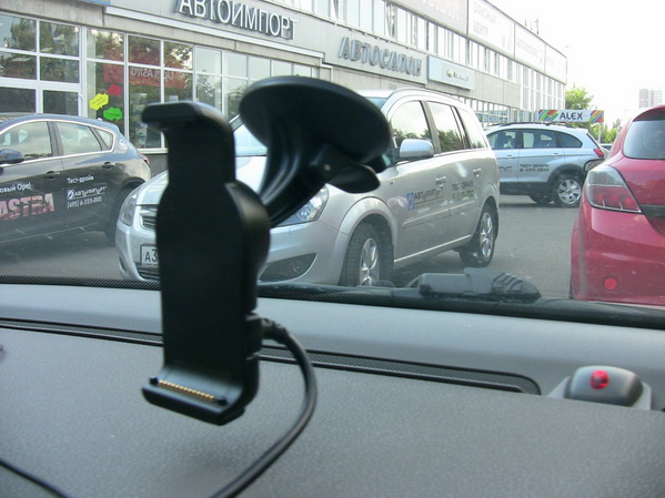 Дуже добре зроблений тримач на лобове скло. Навігатор в нього не просто вставляється, а й тримається за рахунок пружинного фіксатора, який забирається натисненням кнопки. Здавалося б, навіщо ускладнювати конструкцію? А ось навіщо. 2460LT - досить велика модель, тому для надійної її фіксації в тримачі потрібне відповідне зусилля. Висмикуючи подібний пристрій зі звичайного кріплення, найчастіше ми заодно звертаємо на сторону шарнір, збиваючи комфортне положення навігатора щодо очей. У випадку ж з 2460LT достатньо натиснути кнопку і просто взяти навігатор в руку - жодних зусиль!